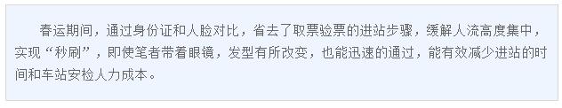 特別是在春運期間,通過身份證和人臉對比,省去了取票驗票的進站步驟,緩解人流高度集中,實現“秒刷”,即使筆者帶著眼鏡,發型有所改變,也能迅速的通過,能有效減少進站的時間和車站安檢人力成本。