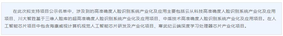 在此次擬支持項(xiàng)目公示名單中,涉及到的高準(zhǔn)確度人臉識(shí)別系統(tǒng)產(chǎn)業(yè)化及應(yīng)用主要包括云從科技高準(zhǔn)確度人臉識(shí)別系統(tǒng)產(chǎn)業(yè)化及應(yīng)用項(xiàng)目、川大智勝基于三維人臉庫的超高準(zhǔn)確度人臉識(shí)別系統(tǒng)產(chǎn)業(yè)化及應(yīng)用項(xiàng)目、中盾技術(shù)高準(zhǔn)確度人臉識(shí)別系統(tǒng)產(chǎn)業(yè)化及應(yīng)用項(xiàng)目。在人工智能芯片項(xiàng)目中包含海康威視計(jì)算機(jī)視覺人工智能芯片研發(fā)及產(chǎn)業(yè)化項(xiàng)目、寒武紀(jì)云端深度學(xué)習(xí)處理器芯片產(chǎn)業(yè)化項(xiàng)目。